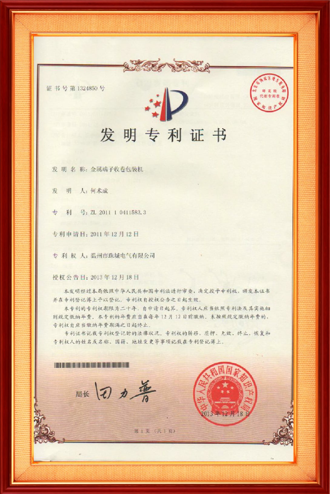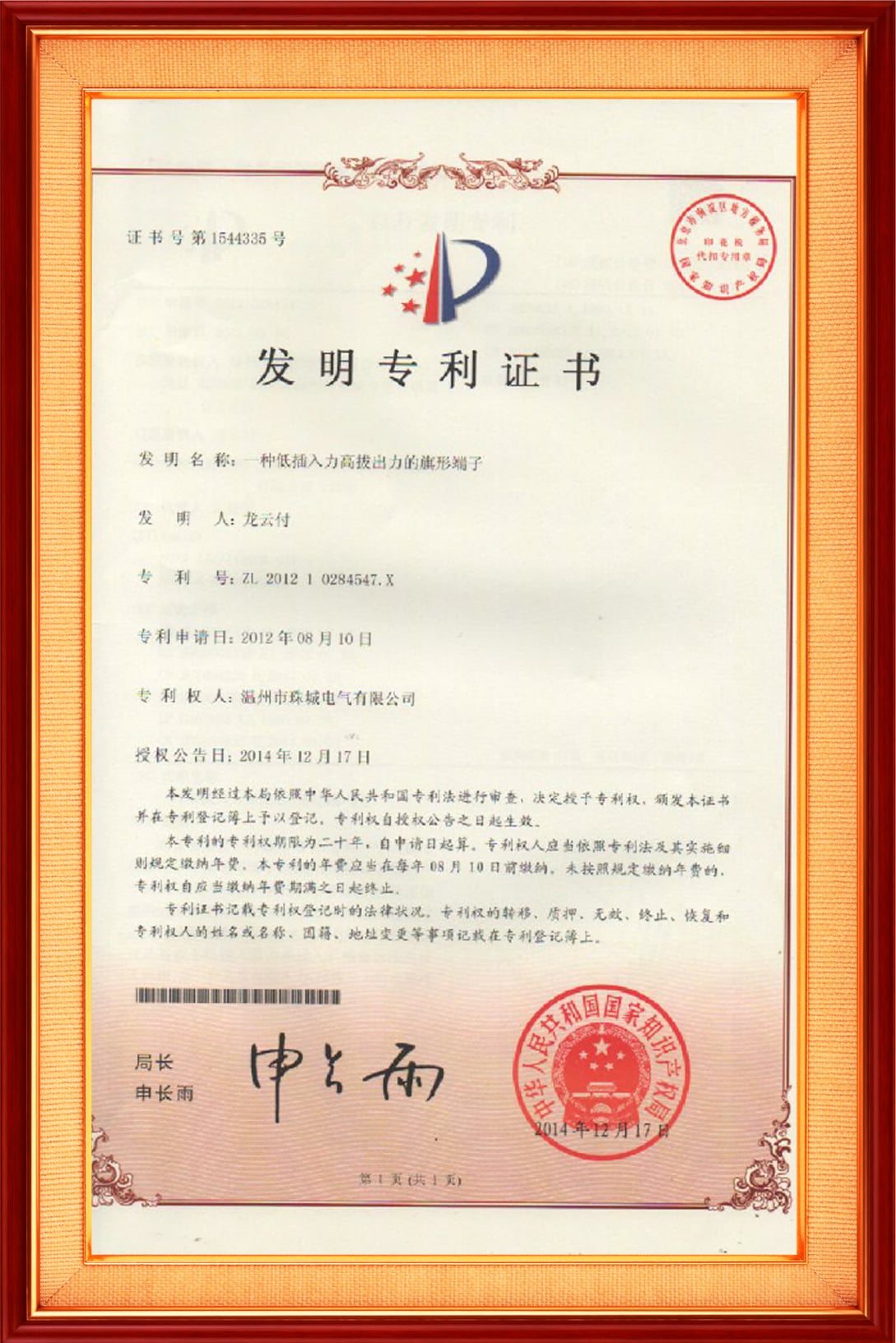 一種用于壓縮機玻璃柱的連接器發(fā)明專利證書